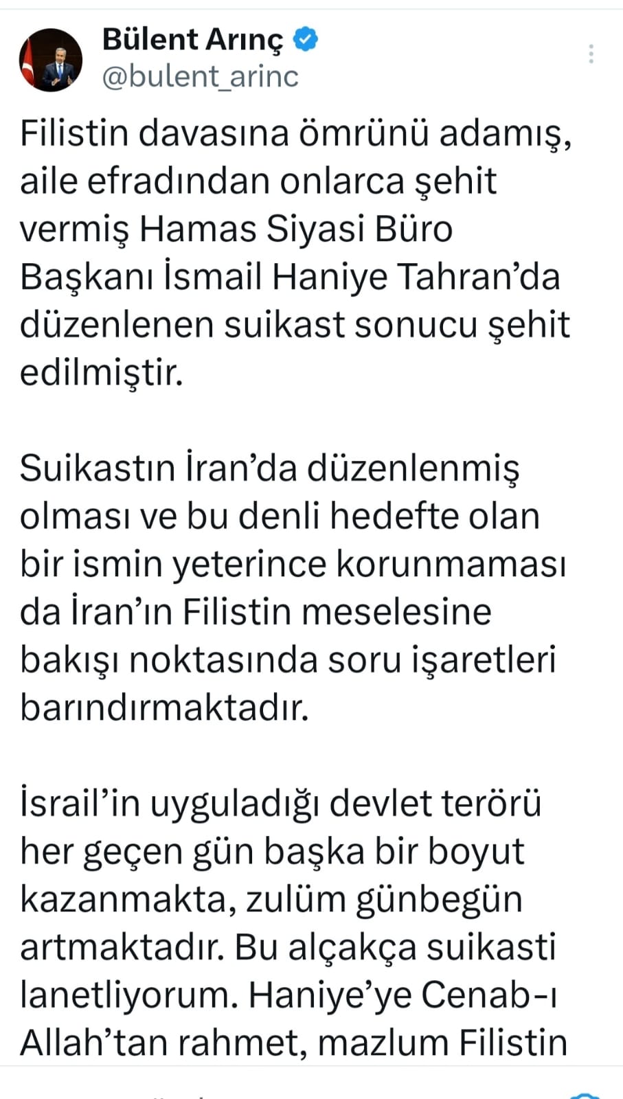 Bu alçakça suikastı lanetliyorum. Haniye’ye Cenab-ı Allah’tan rahmet, mazlum Filistin halkına başsağlığı diliyorum.