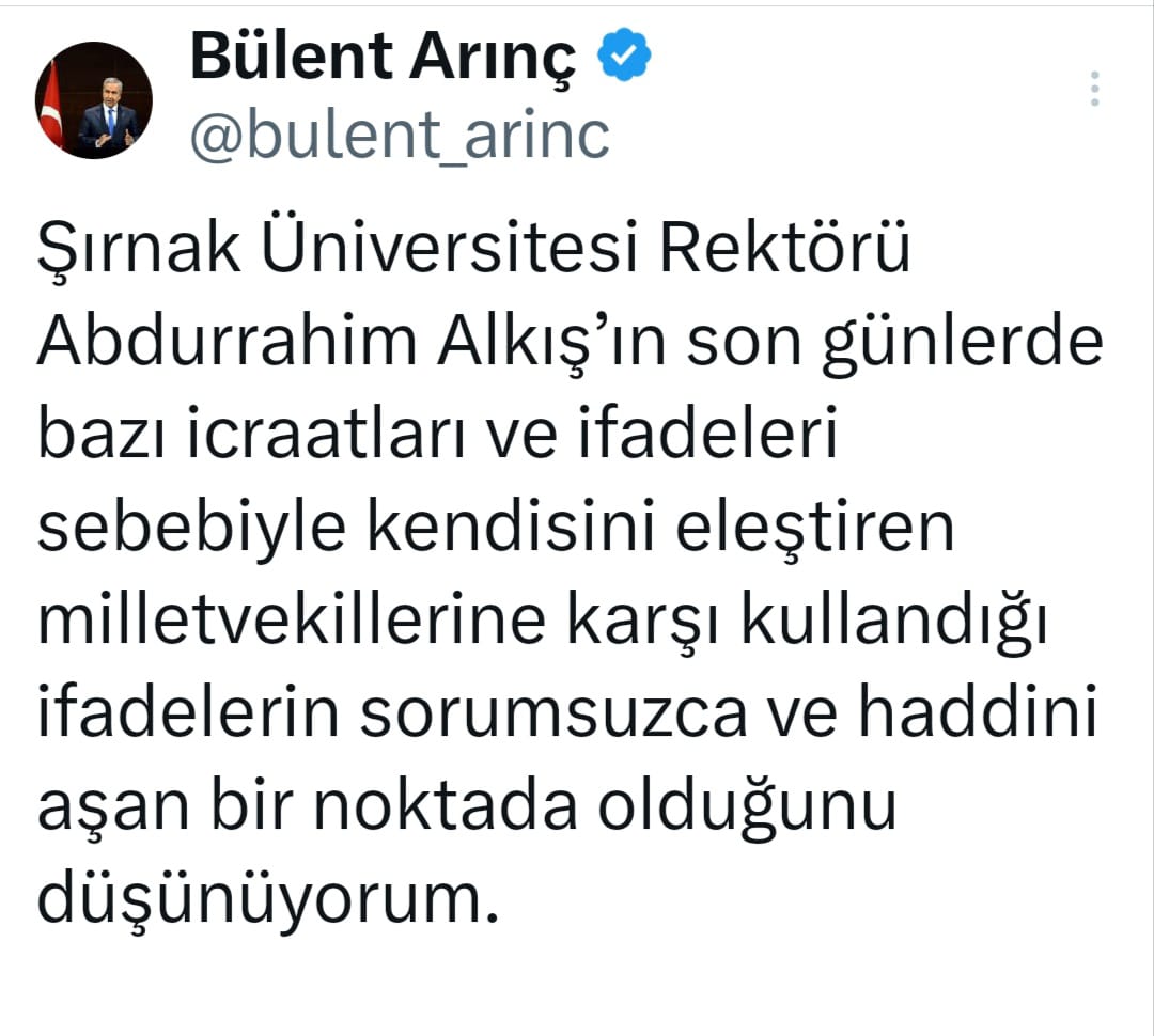 22. Dönem TBMM Başkanı Bülent Arınç, Halkın oyları ile seçilmiş milletvekillerine ‘münafık’ diyen “Şırnak Üniversitesi Rektörü Abdurrahim Alkış’a sert tepki gösterdi.