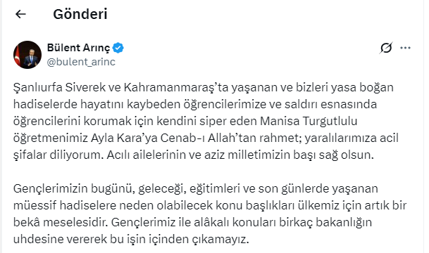 “Şanlıurfa Siverek ve Kahramanmaraş’ta yaşanan ve bizleri yasa boğan hadiselerde hayatını kaybeden öğrencilerimize ve saldırı esnasında öğrencilerini korumak için kendini siper eden Manisa Turgutlulu öğretmenimiz Ayla Kara’ya Cenab-ı Allah’tan rahmet; yaralılarımıza acil şifalar diliyorum. Acılı ailelerinin ve aziz milletimizin başı sağ olsun.